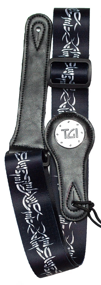 Nylon Weave guitar strap with graphic print. Leather ends.