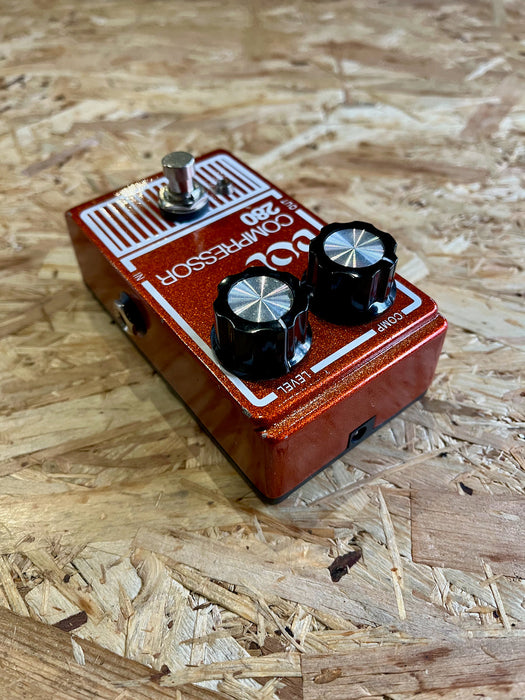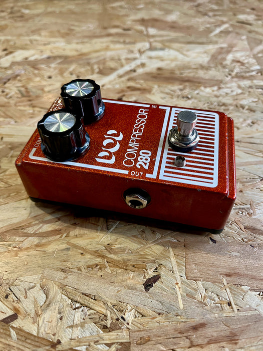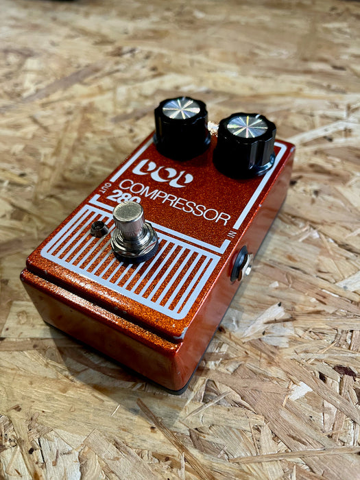The 280 is an optical compressor that can go from light sustain to utterly smashed with the turn of a knob. Unlike faster non-optical circuits the 280 retains your high frequencies until you get into the more extreme settings. The 280 is ideal for chicken-pickin’, added sustain for leads, or snappy-slappy funk rhythm. The 280 also has enough output to be used as a lead boost with added compressor sustain. And like all of the updated DOD pedal, it has a modern power jack, LED, light but strong aluminum chassis, and true bypass switching.