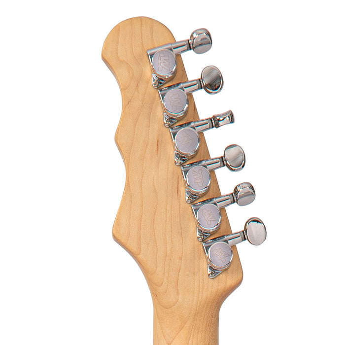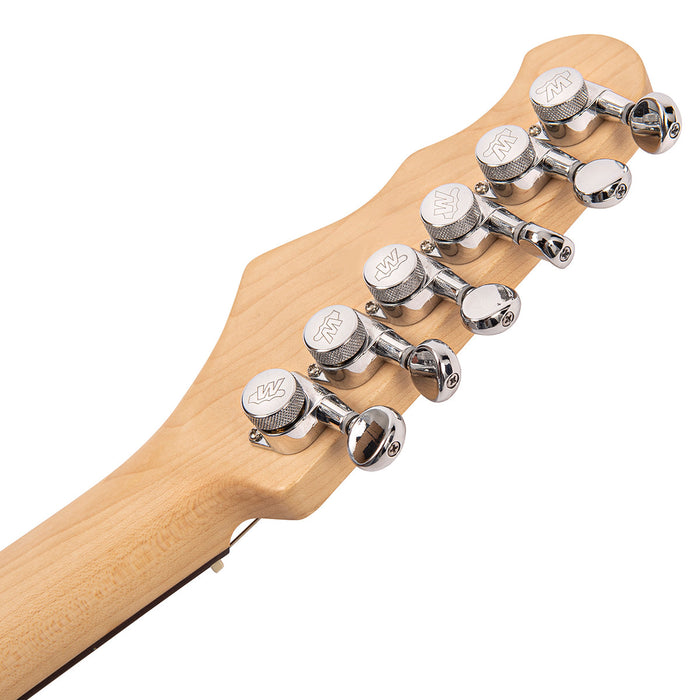 Wilkinson® WJ05 pin-lock locking machine heads with staggered string post heights provide correct string rake angle for snag free, smooth vibrato action and correct playing tension.