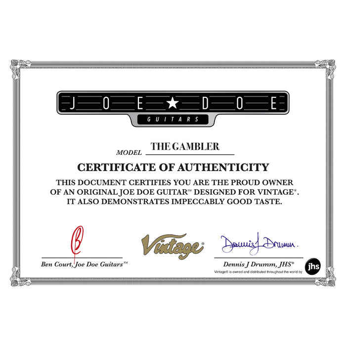 Limited Edition of 100 'Gambler' is an original Vintage® guitar, designed and created by Joe Doe Guitars and the UK Vintage design team.