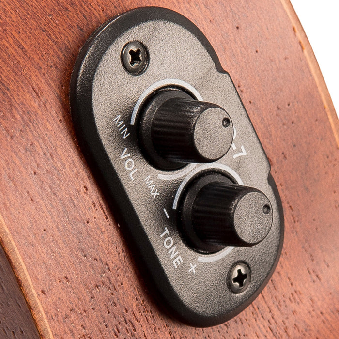 Sapele is the tonewood choice for the top back and sides, specifically chosen for its warm, woody sound, delivering a strong low-end, solid mids and natural high-end response. Features also include an intricate laser etched palm tree rosette and headstock design, with Laka motif and chrome plated die-cast tuners.