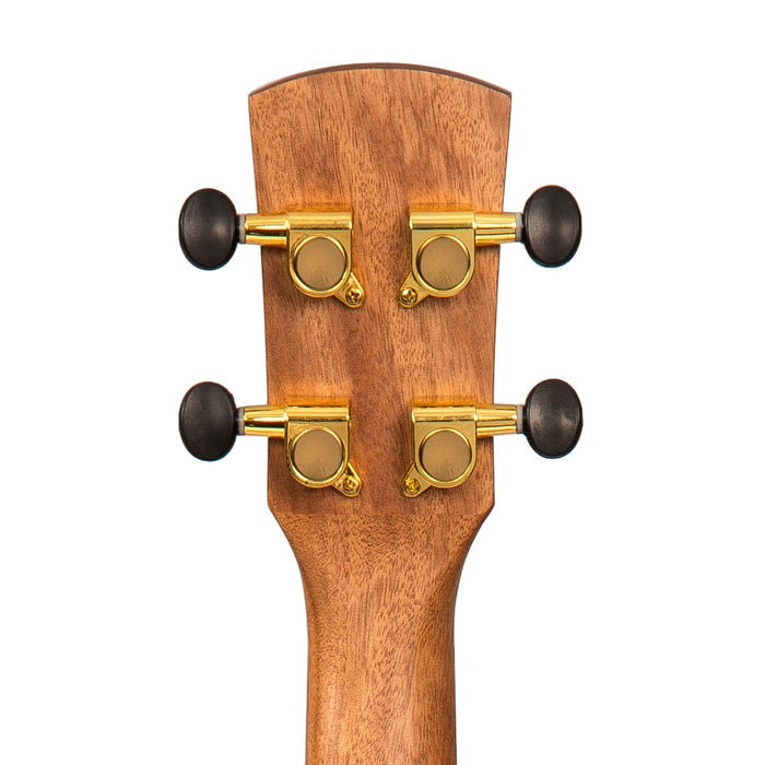 The Lake Maple Series Tenor Ukulele with stunning appointments that include a figured flame maple top, back and sides, wood bindings, intricate faux abalone rosette design, capped heel, okoume neck, ABS nut, walnut capped headstock, walnut fingerboard with pearl inlays, black walnut bridge and gold plated die-cast machine heads with black buttons is indeed, dressed to impress.