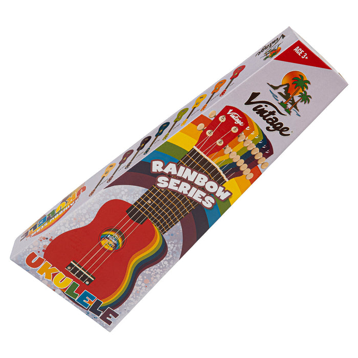 The Vintage Laka Rainbow Soprano Series ukulele includes a Vintage Laka carry bag and coloured box presentation.