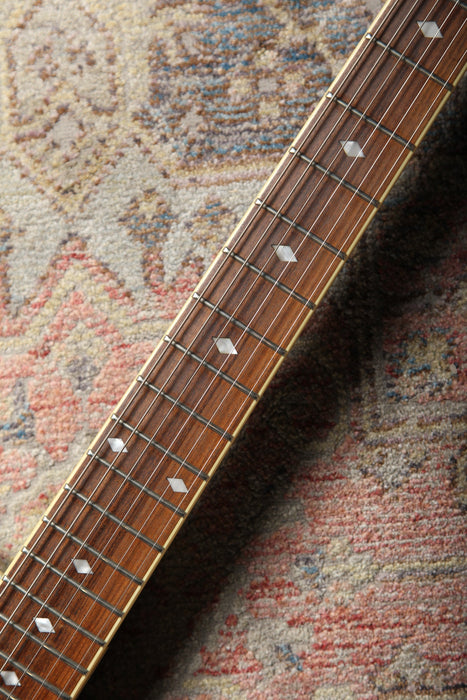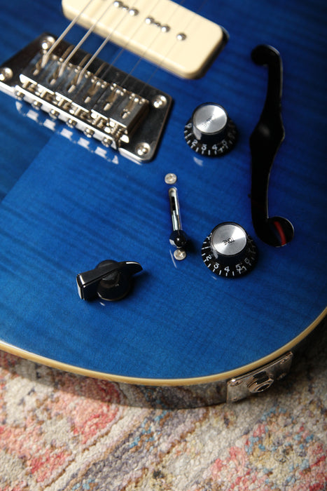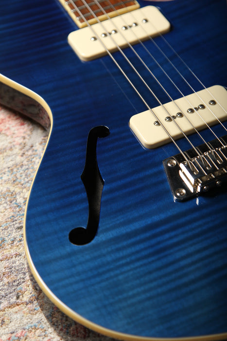 This semi-hollow guitar is constructed from a contoured mahogany body, capped with a AAA flamed laminate maple top finished in a unique 'Midnight Sapphire' translucent finish. It's set neck, also made of mahogany, features a classic slim taper D profile and is paired with a rosewood fretboard complete with diamond inlays.