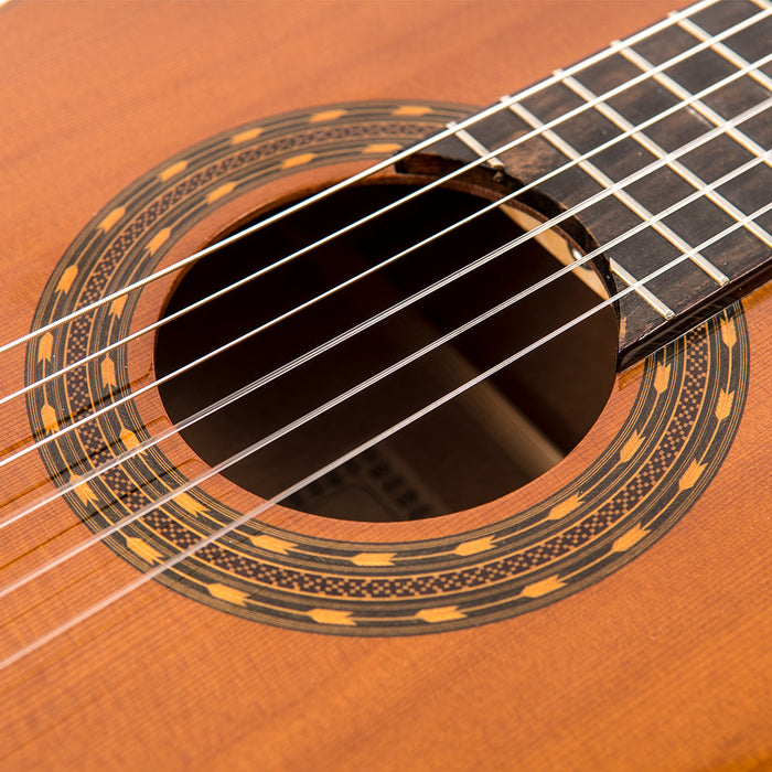 The inlaid bridge, precision cut, bone nut and saddle also contribute to the warm and mellow tone, which makes this fine acoustic guitar ideal for electric and steel-strung guitarists making the move to classical.