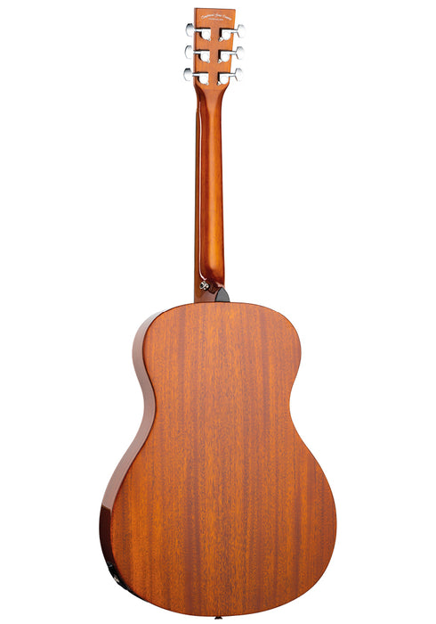 The guitar’s Mahogany top serves as the heart of its tonal character. Mahogany is celebrated for its ability to produce a warm, well-balanced sound with a rich midrange. The Mahogany back and sides further enhance the guitar’s tonal depth, delivering a warm, resonant low end and a clear, mellow treble. This combination of tonewoods results in a characteristically balanced and intimate sound profile that’s perfect for fingerstyle playing and intimate acoustic settings.
