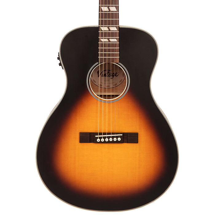 With a beautiful satin top coat over a gorgeous Vintage Sunburst finish, the Vintage Historic Series Parlour electro-acoustic guitar, radiates class in every sense of the word.